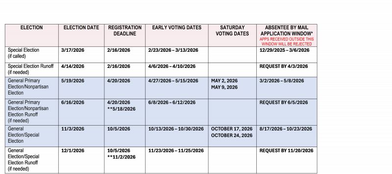 - Absentee applications for the upcoming December 2, 2025 SPECIAL ELECTION RUNOFF for District 4 County Commissioner can be submitted until November 21, 2025. Absentee Ballots will be mailed out as soon as ballots are received from the ballot printer.