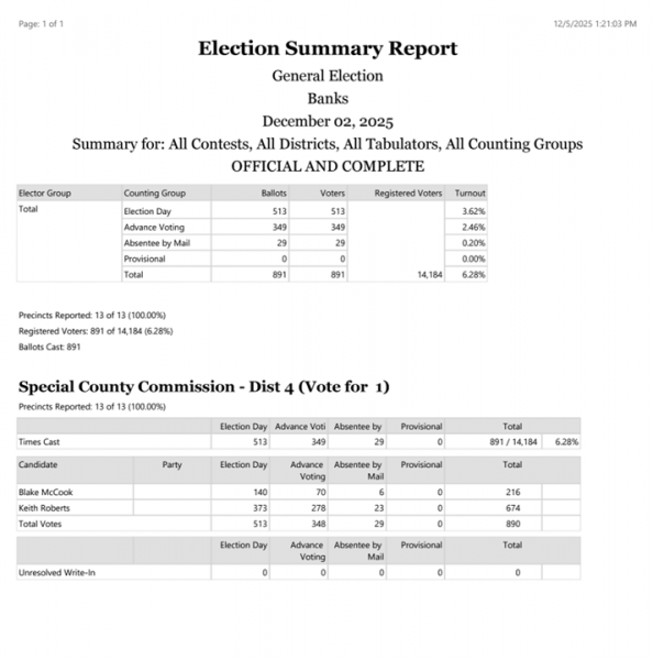 AUDIT REPORT FOR THE NOVEMBER 4, 2025 MUNICIPAL GENERAL/SPECIAL ELECTION/SPECIAL ELECTION FOR PUBLIC SERVICE COMMISSIONER