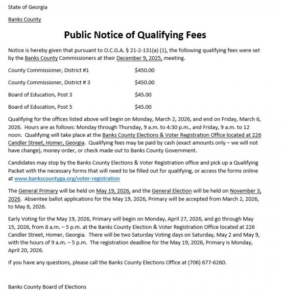 2026 BANKS COUNTY QUALIFYING INFORMATION